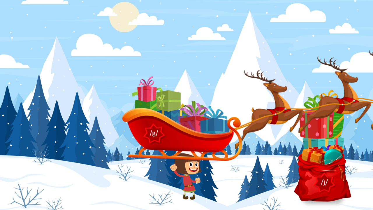 Aujourd’hui, je vous propose une activité de tri de cadeaux, mais surtout de mots, selon leur prononciation, pour travailler sur la graphie contextuelle du « G ». L’enfant doit choisir où vont les cadeaux : les étiquettes avec les prénoms contenant le /g/ vont dans le traineau, les /j/ dans la hotte.