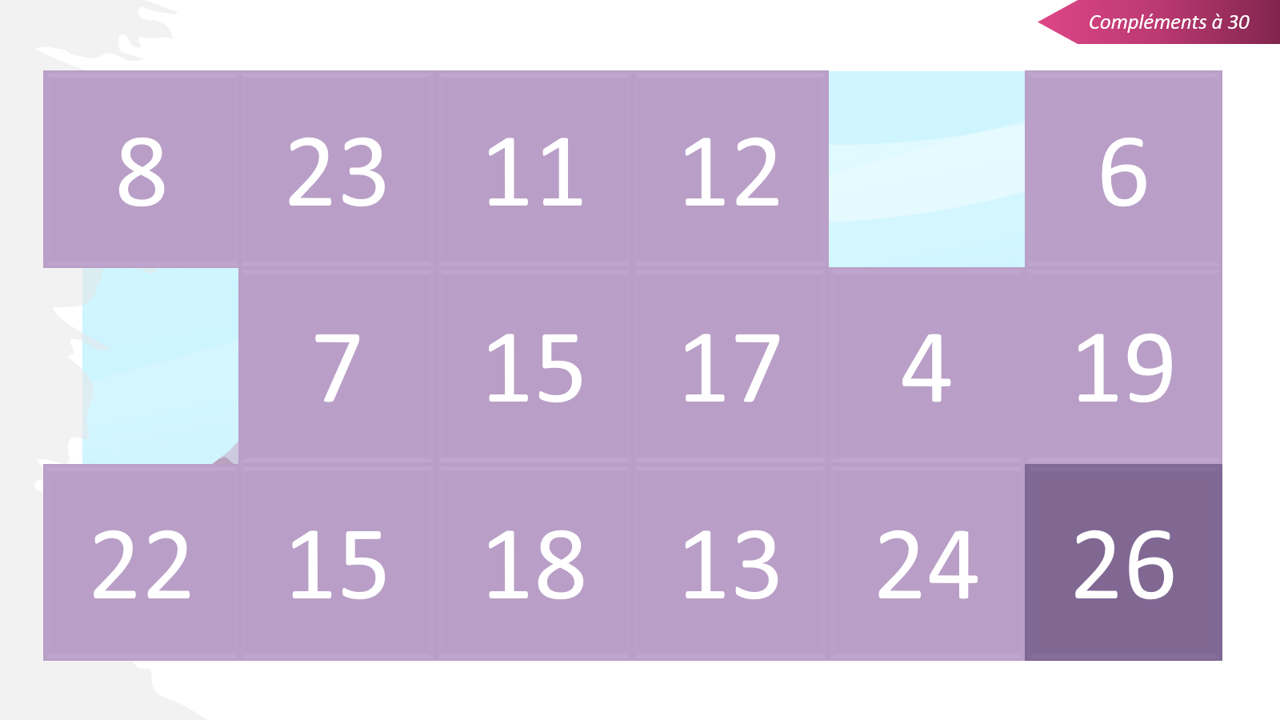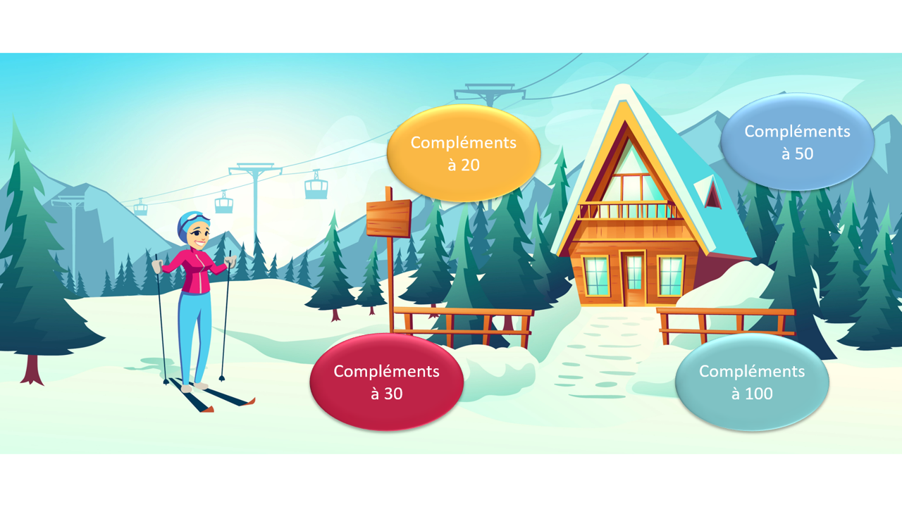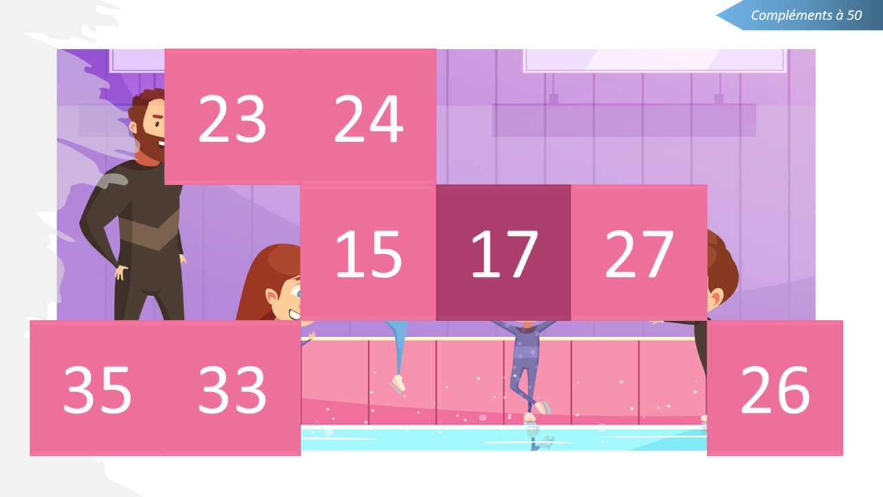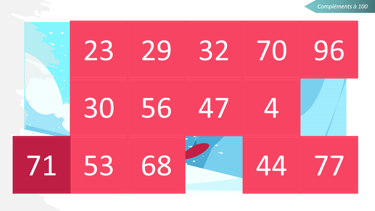 Je vous propose des images à dévoiler pour ce 17e jour du calendrier. Il s’agit de trouver le complément à 20, 30, 50 ou 100. L’enfant doit cliquer sur le bon complément pour supprimer les cases et voir l’image apparaître.