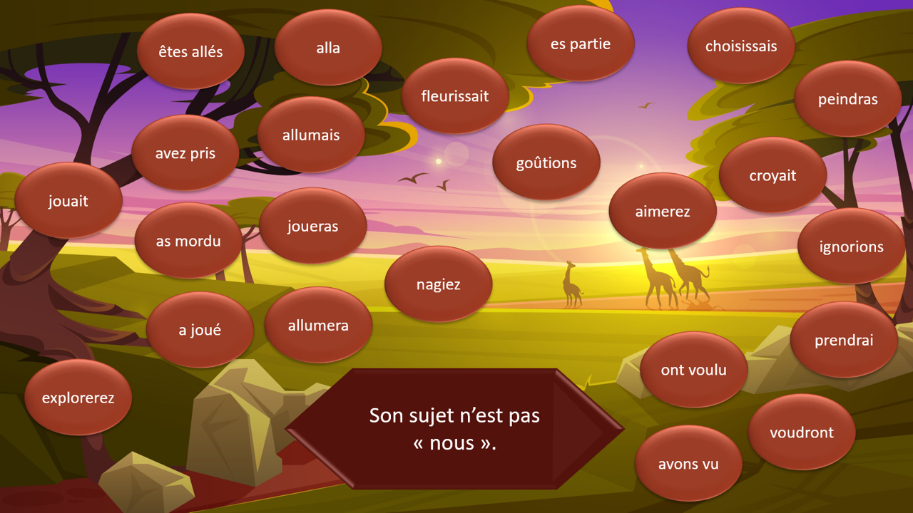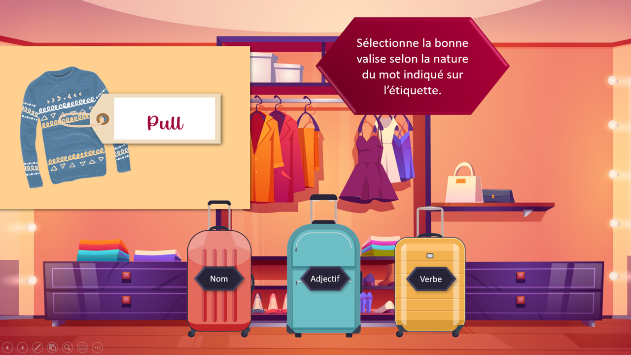 – identification des natures de mots (nom, verbe, adjectif) ;
