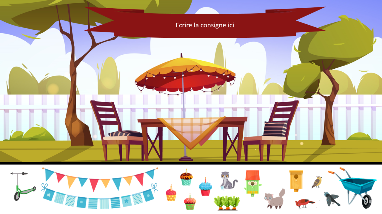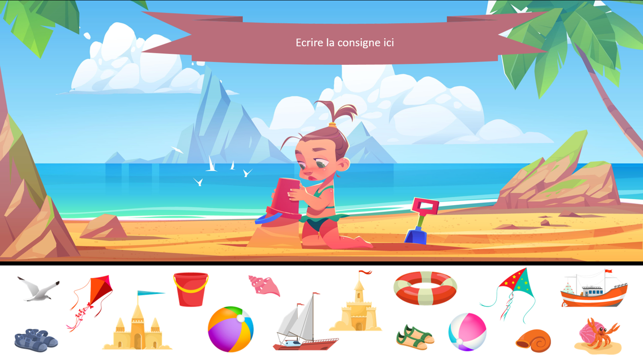 Pour célébrer les vacances d’été, je vous partage aujourd’hui les traditionnelles scènes à compléter sur consignes. Il s’agit d’écrire ou dire une consigne que l’autre participant.e doit appliquer. Tout simple, mais utilisable dans de nombreuses situations !