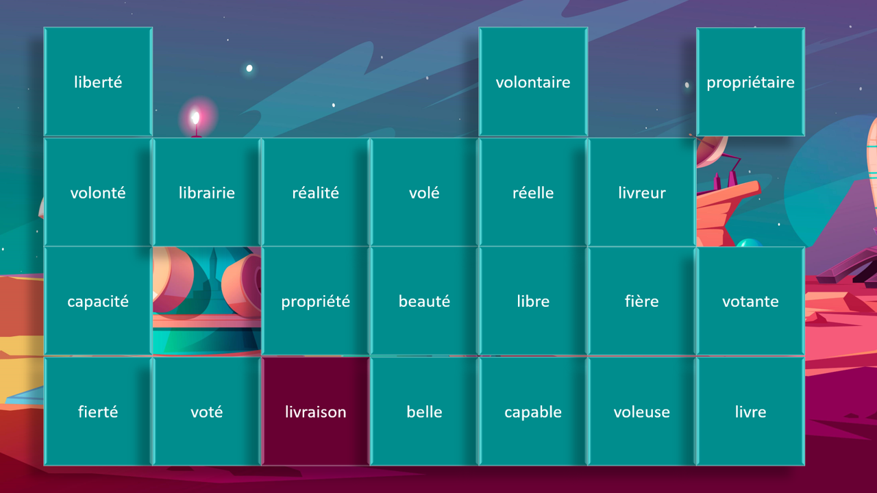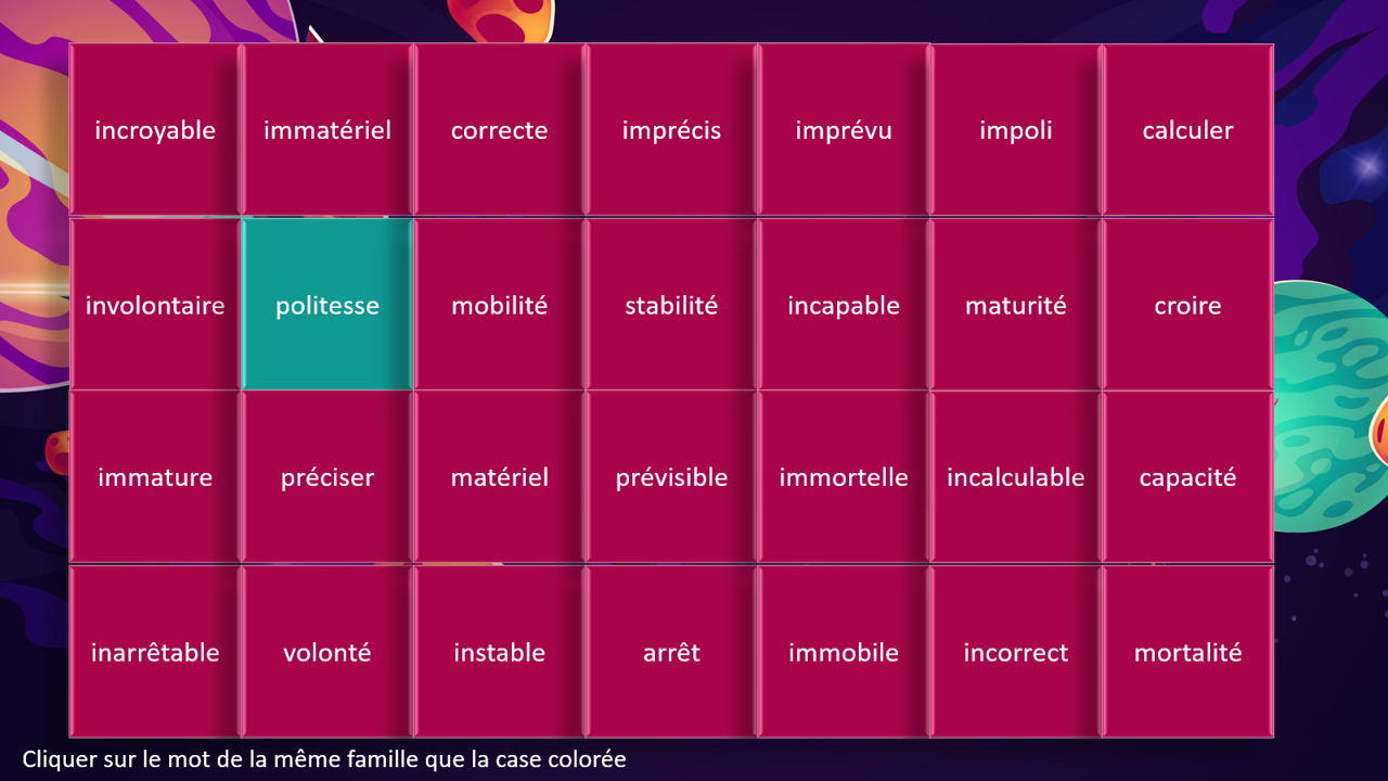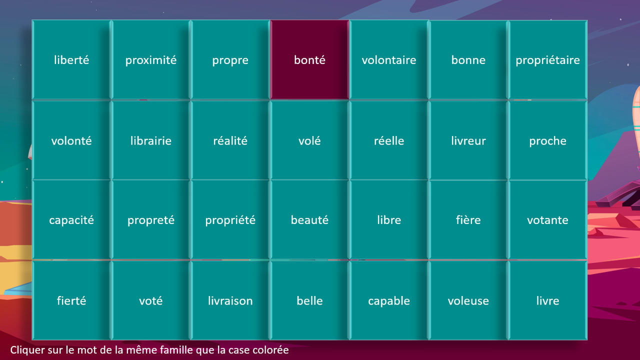 Je vous propose un ensemble de deux jeux pour s’entraîner à repérer des mots de la même famille. L’objectif des deux jeux est d’associer deux mots de la même famille pour découvrir progressivement l’image de fond.