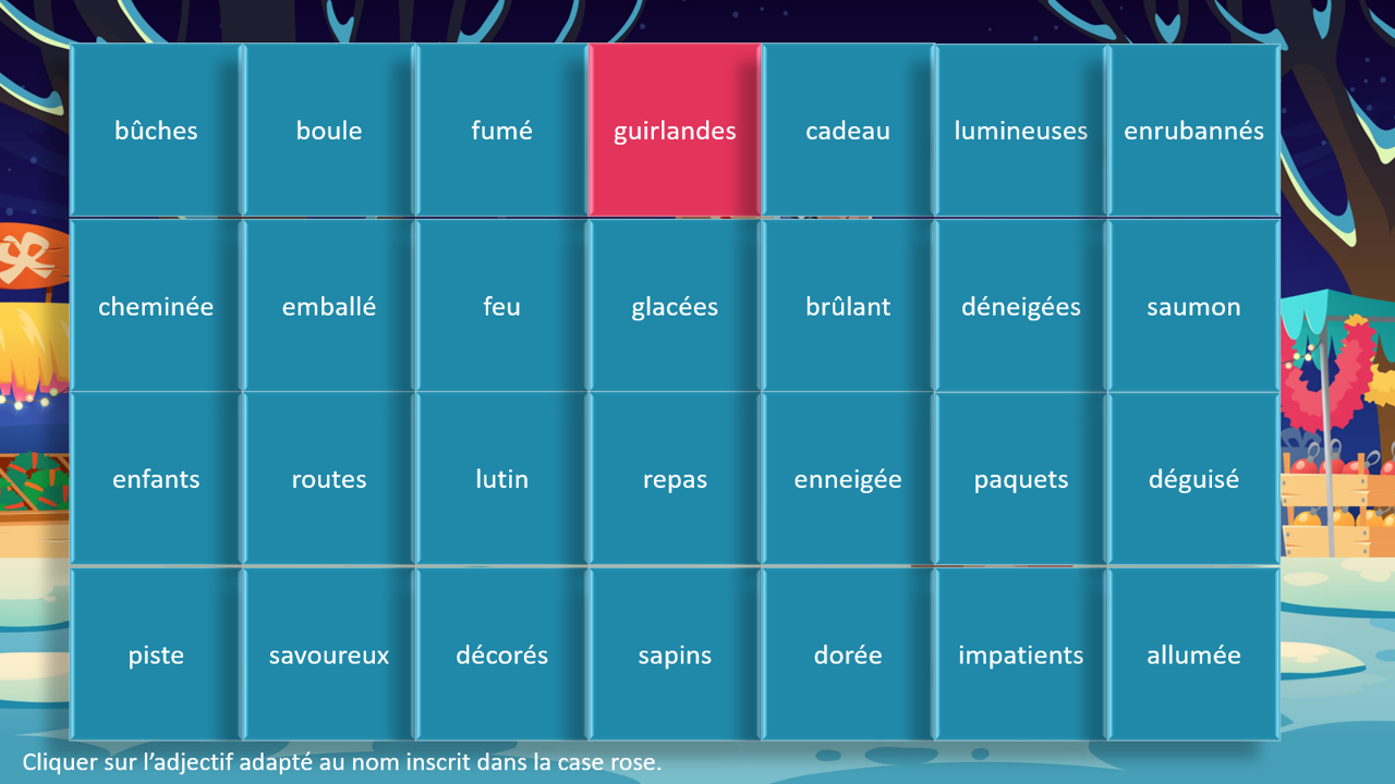 Je vous partage aujourd’hui un support power point dans lequel il faut découvrir une image en éliminant les mots progressivement. Il s’agit d’associer un adjectif au nom qui est surligné (faire attention au sens mais aussi aux accords).