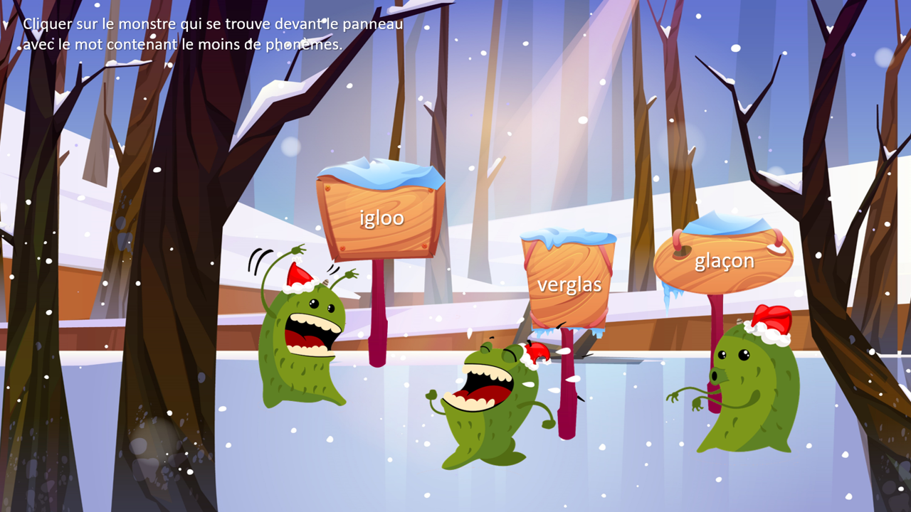 Pour ce 18e jour du calendrier, je vous partage un support pour travailler la segmentation phonémique en s’appuyant sur des mots écrits. Il faut trouver le grinch placé devant le mot contenant le moins de sons, il tombera alors dans un piège glacé !