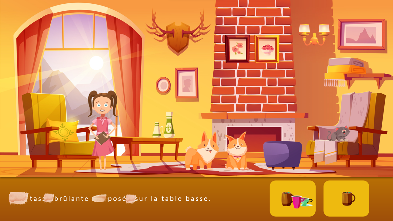 Voici un exercice interactif dans lequel l’enfant doit sélectionner la bonne image (singulier ou pluriel) selon les indices morphosyntaxiques présents dans la phrase. Mais des taches empêchent de tout déchiffrer. Il faudra donc se servir du seul indice restant (terminaison d’un verbe ou d’un adjectif).