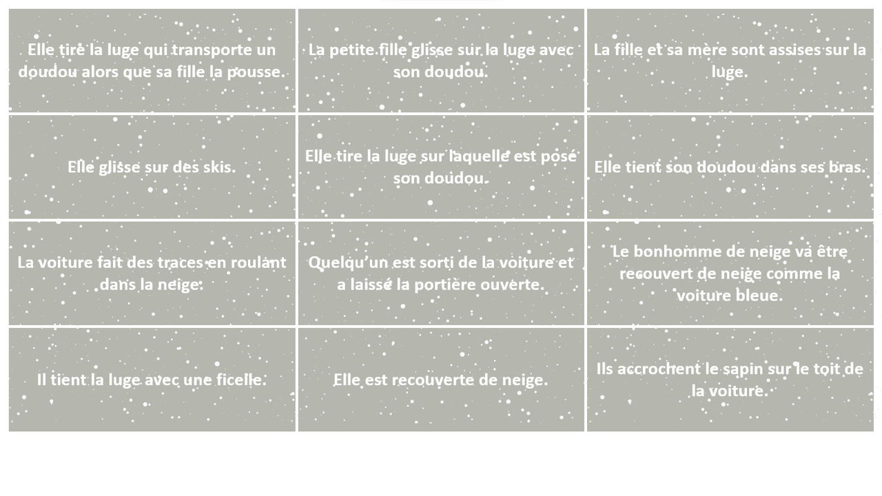 Je vous propose ces 4 planches de photos, soit 24 photos sur le thème de l’hiver, ainsi que 24 phrases écrites à imprimer et à découper pour travailler avec des enfants comme des adultes le langage.