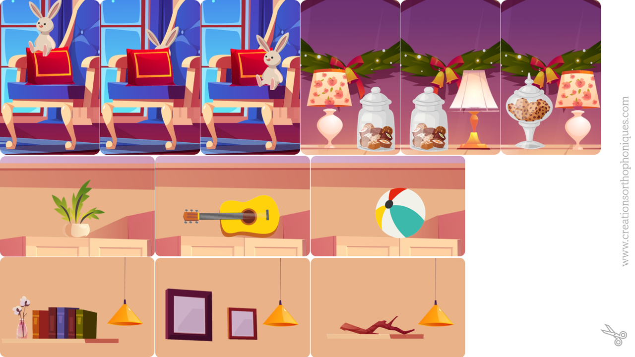 Je vous propose 3 scènes illustrées à imprimer (une sur le thème de Noël, une sur l’hiver, l’autre sur une chambre d’enfant), à compléter avec 5 cartes (3 variantes pour chacune), à choisir en fonction du modéle ou de la consigne donnée à l’oral ou à l’écrit.