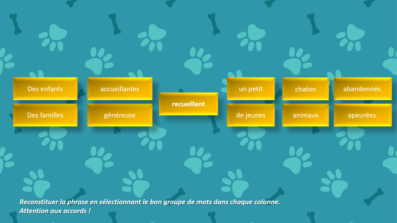 Il est destiné aux enfants de primaire ou début de collège avec des difficultés en langage écrit, et notamment en orthographe grammaticale. Pour réaliser cet exercice, il faut que les notions d’accords dans les groupes nominaux et du verbe aient été comprises, car il s’agit d’une activité de généralisation.