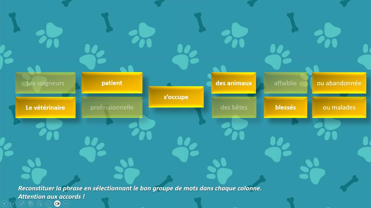 Je vous propose une activité dans laquelle il faut reconstituer des phrases en se basant sur les indices syntaxiques. Ensuite, l’image correspondant à la phrase apparaît.