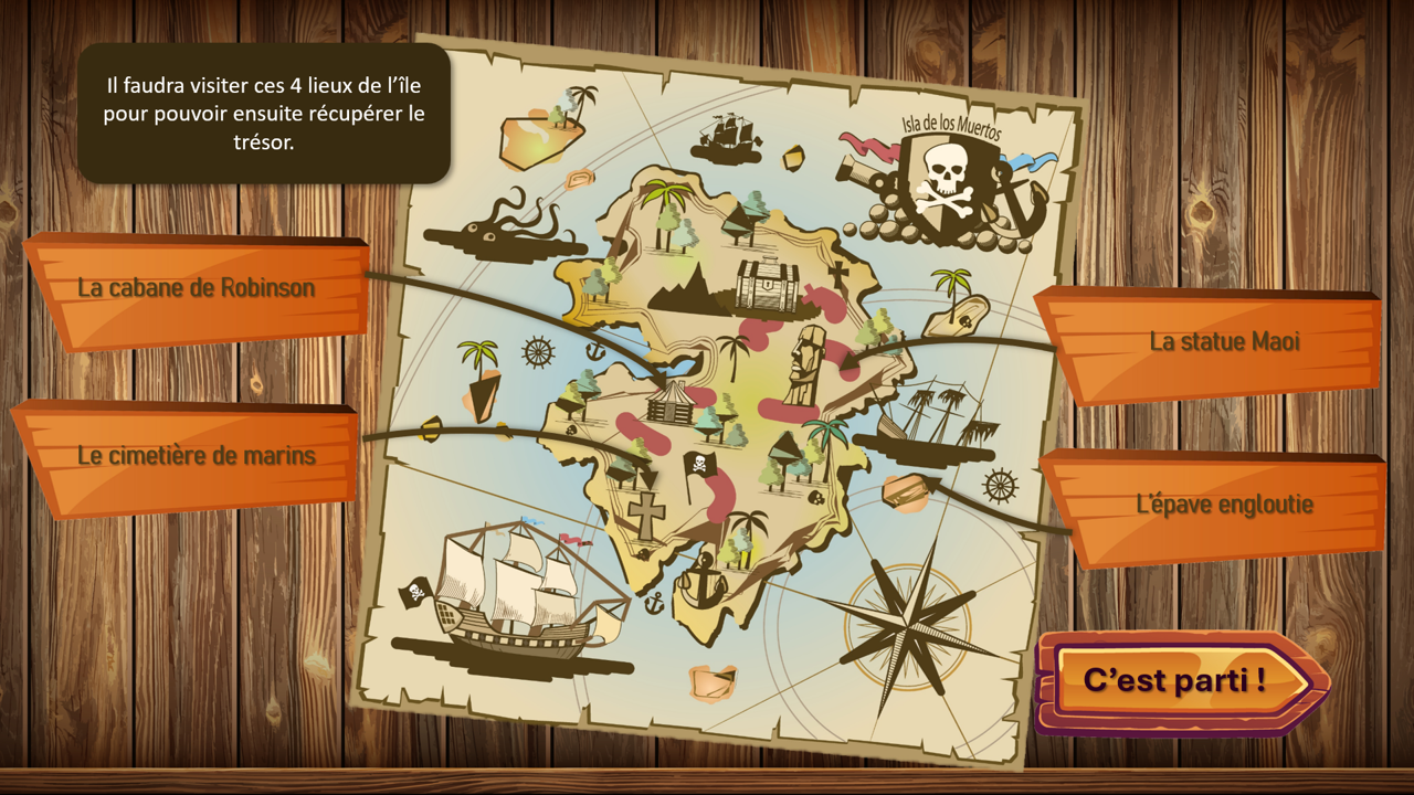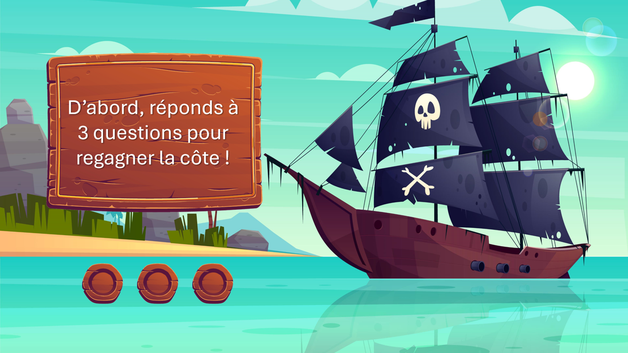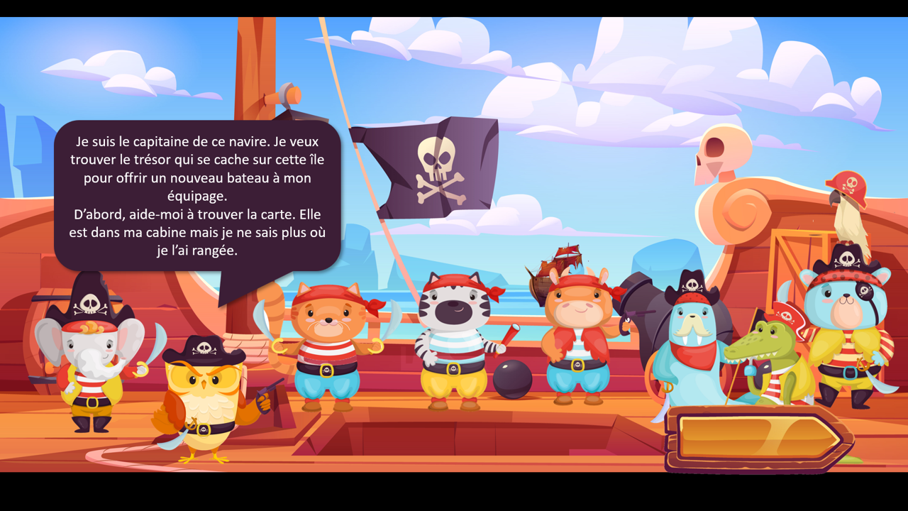 Le Trésor de l’Île des Morts est un support interactif sur PowerPoint qui plonge vos patients dans une quête palpitante ! 🏝️ Vous rejoignez un équipage de pirates animaliers, dirigé par leur capitaine, bien décidé à trouver un trésor pour offrir un nouveau bateau à ses camarades.