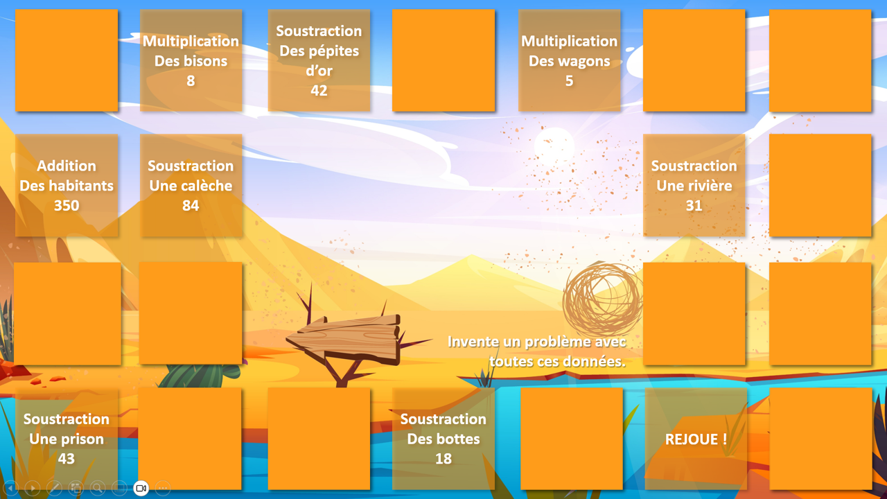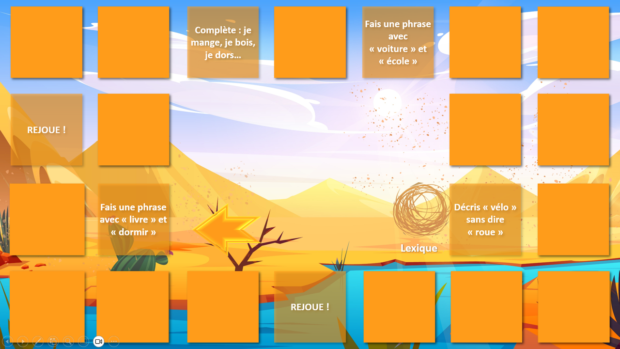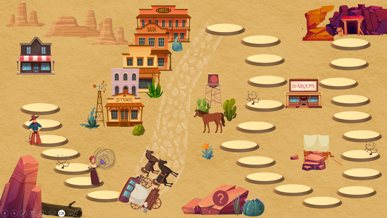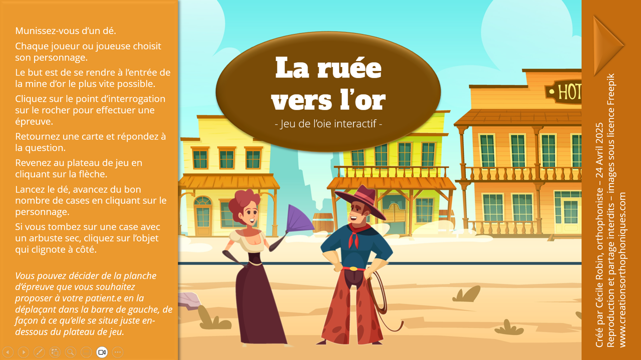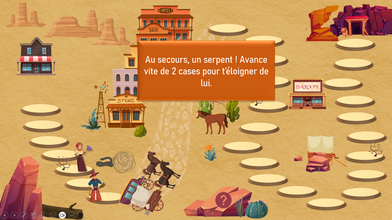 Ce jeu de l’oie interactif, à utiliser sur PowerPoint en mode diaporama, propose une aventure immersive au cœur des saloons, des canyons et des pépites d’or… Chaque joueur avance sur le plateau, et sur certaines cases, un clic sur l’icône déclenche une animation surprise : piège ou chance ? À vous de jouer !