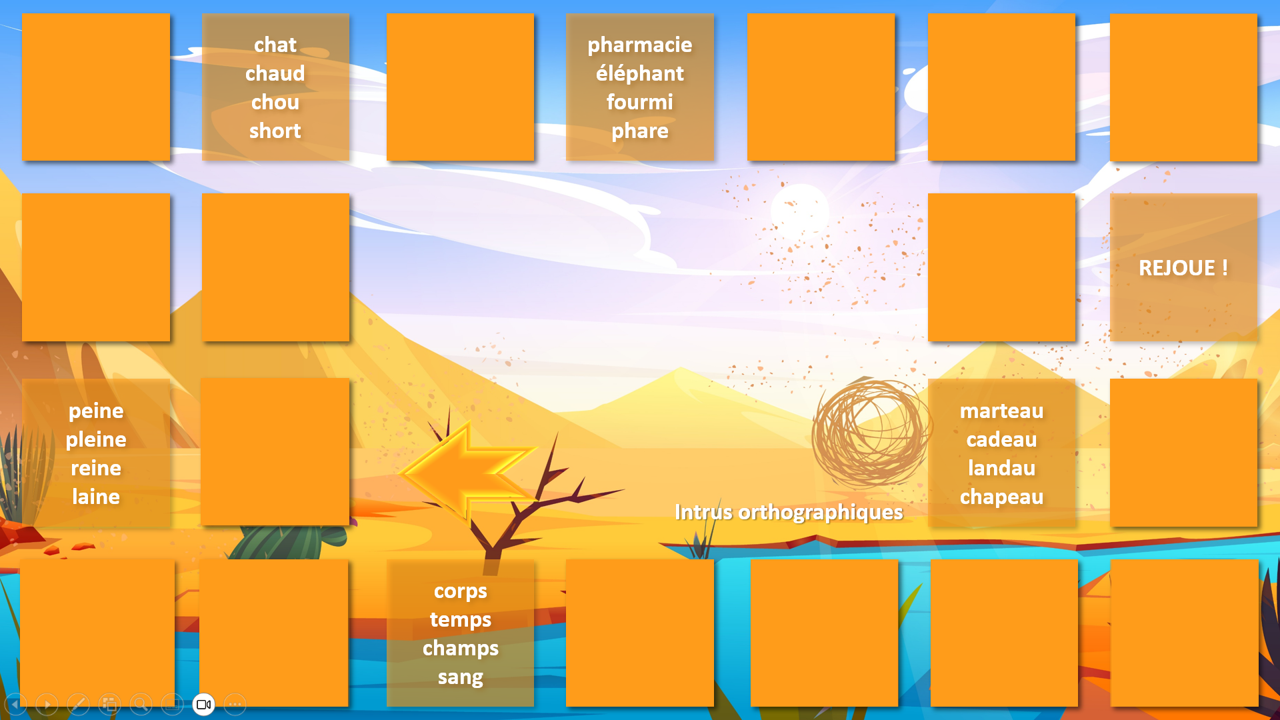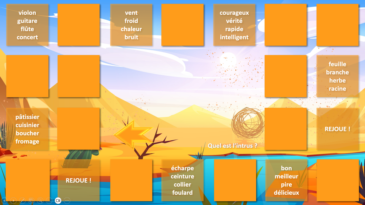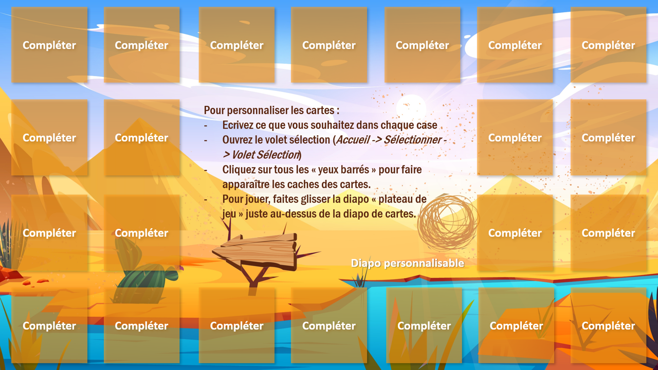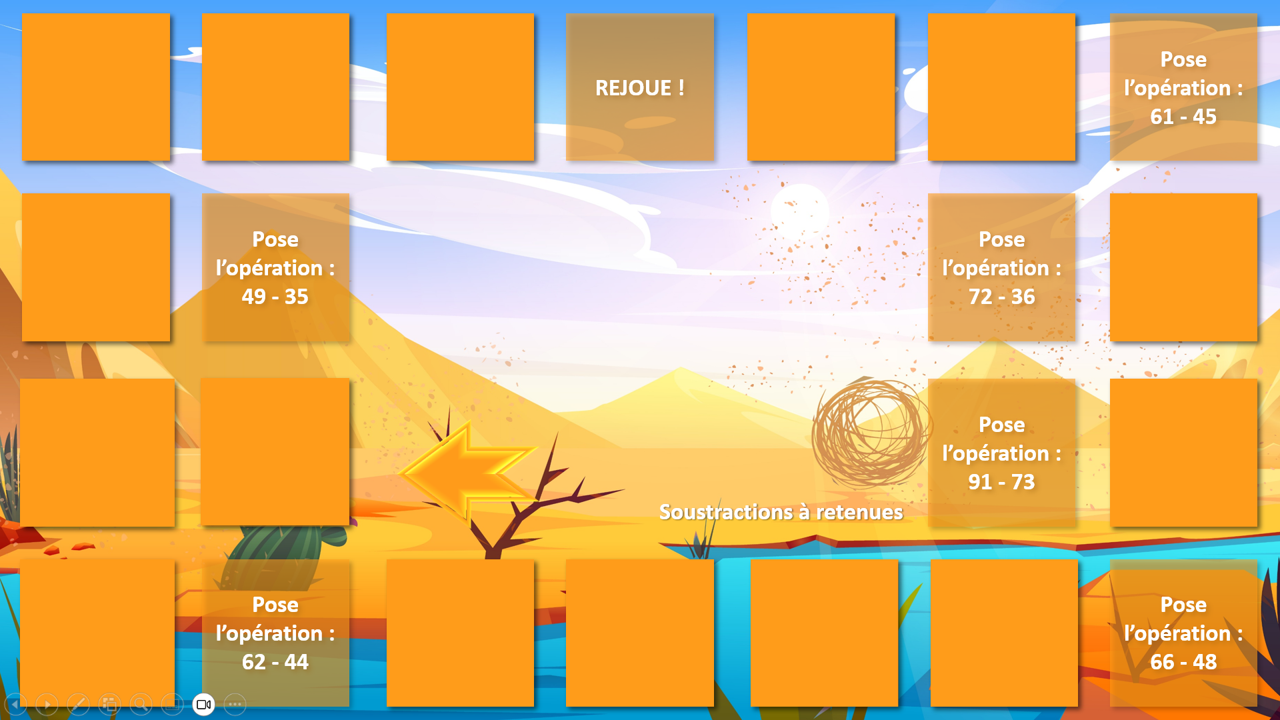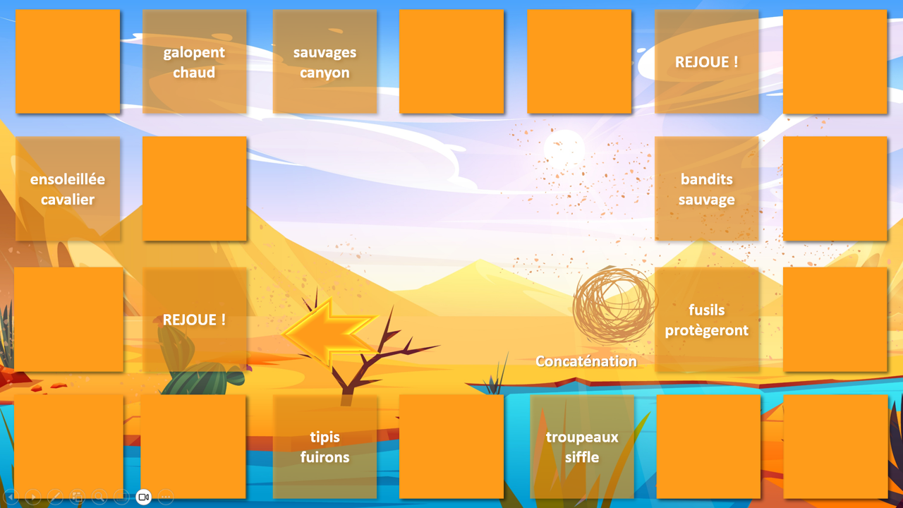 Ce jeu de l’oie interactif, à utiliser sur PowerPoint en mode diaporama, propose une aventure immersive au cœur des saloons, des canyons et des pépites d’or… Chaque joueur avance sur le plateau, et sur certaines cases, un clic sur l’icône déclenche une animation surprise : piège ou chance ? À vous de jouer !