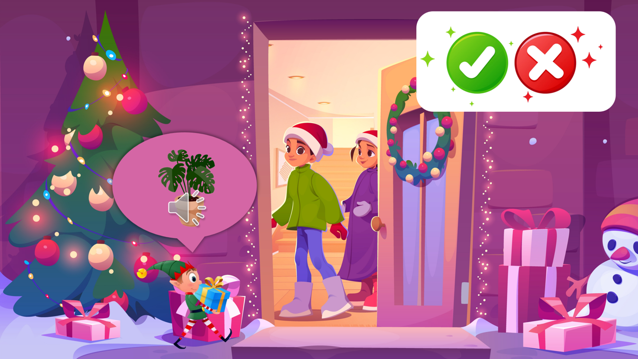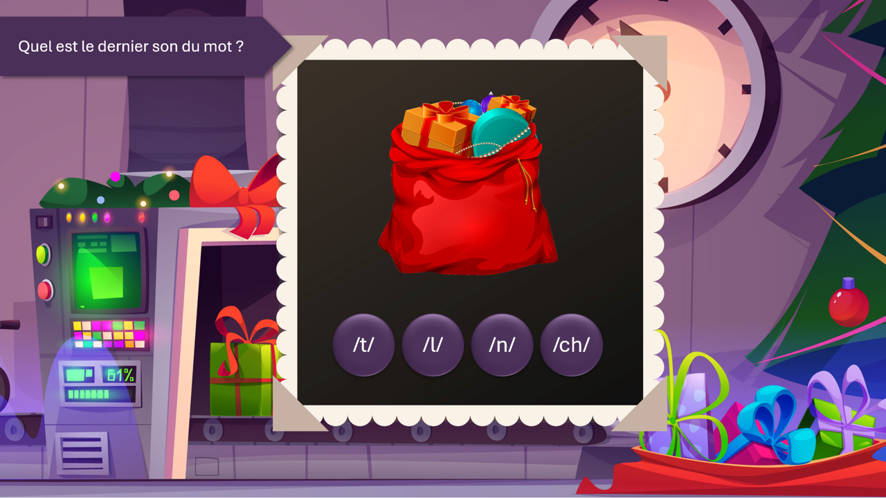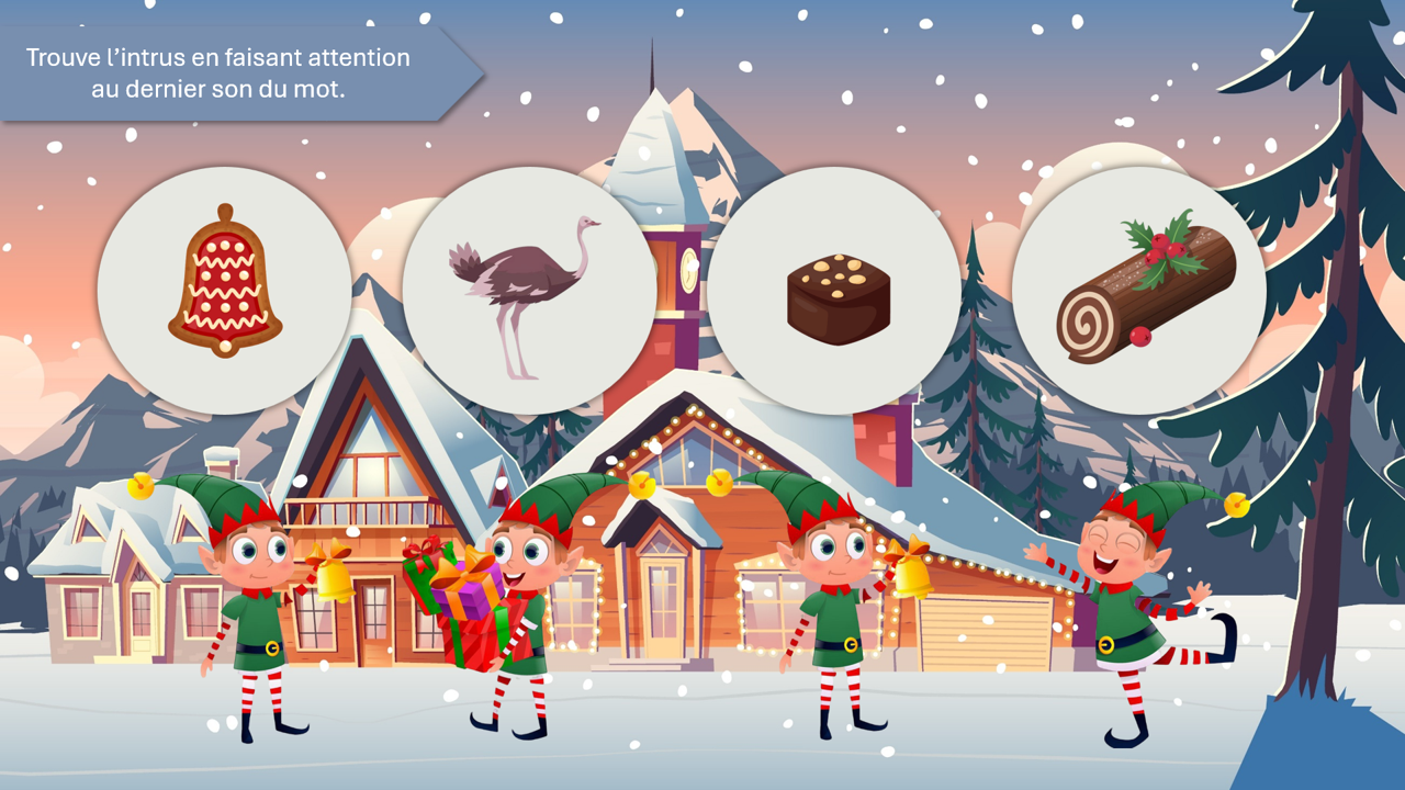 Un lutin arrive devant une maison avec un cadeau. Si le mot est correctement prononcé (avec le phonème final), il peut entrer. Sinon, il repart.